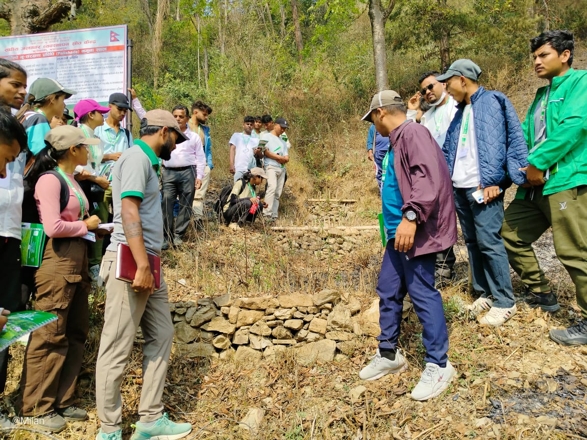 BSc Forestry scholars exploring the low-cost pallisade demonstration site at FWMRC, enhancing their knowledge of low cost soil conservation techniques-Chaitra 15, 2081